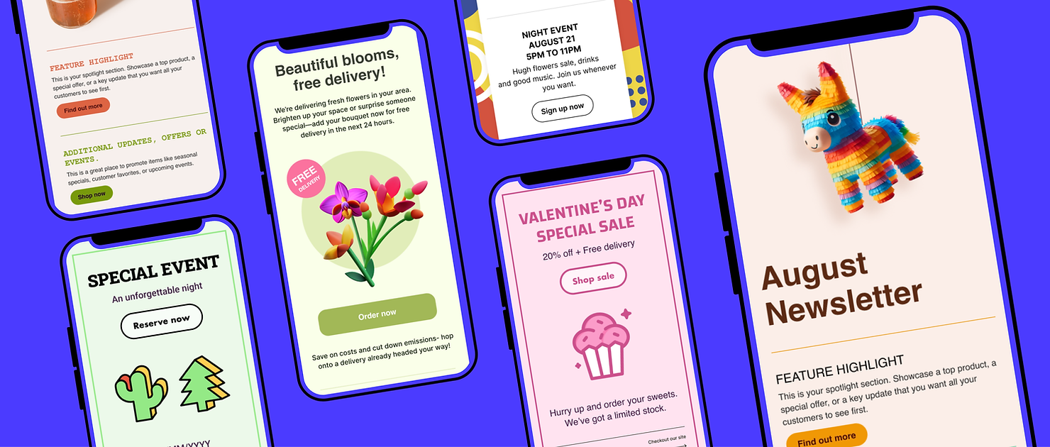 Choose from a range of vibrant, pre-designed templates to quickly design beautiful marketing campaigns. Our promotions templates are easy to customise, making it simple to create professional and personalised offers.