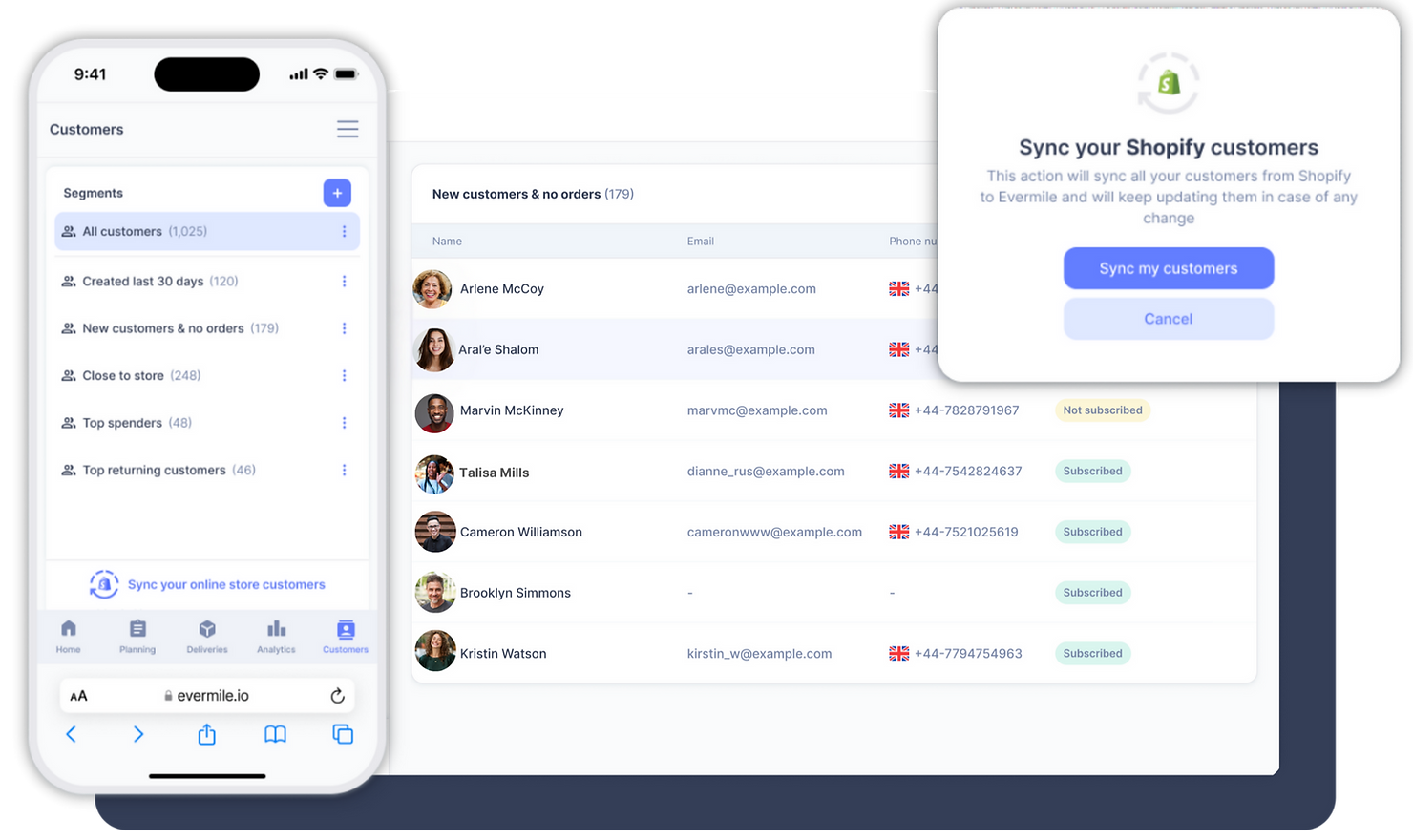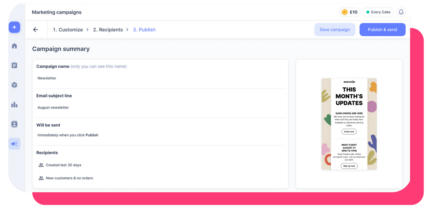 Start by choosing a group of customers from your Evermile database. If some customer data isn’t in Evermile yet, you can quickly import it from your e-commerce platform, CRM, or other tools. You can send promotions to all customers or target a specific group based on criteria like postcode, last order date, or purchase history.